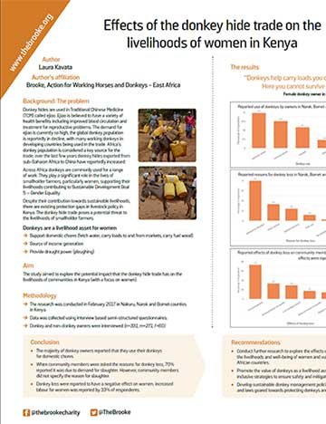In 2017, Brooke conducted a research study to look at the potential impact of the donkey hide trade on the livelihoods of smallholder farmers in Kenya, with women being a focus of the study. Results from this study will act as a starting point to gain a better understanding of the effects of this trade.