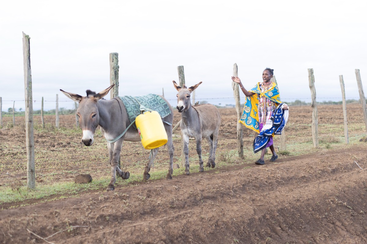 A Kenyan woman collects water with her donkeys.